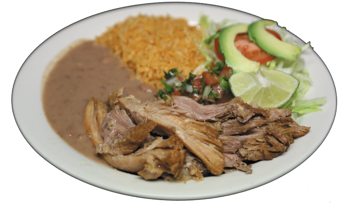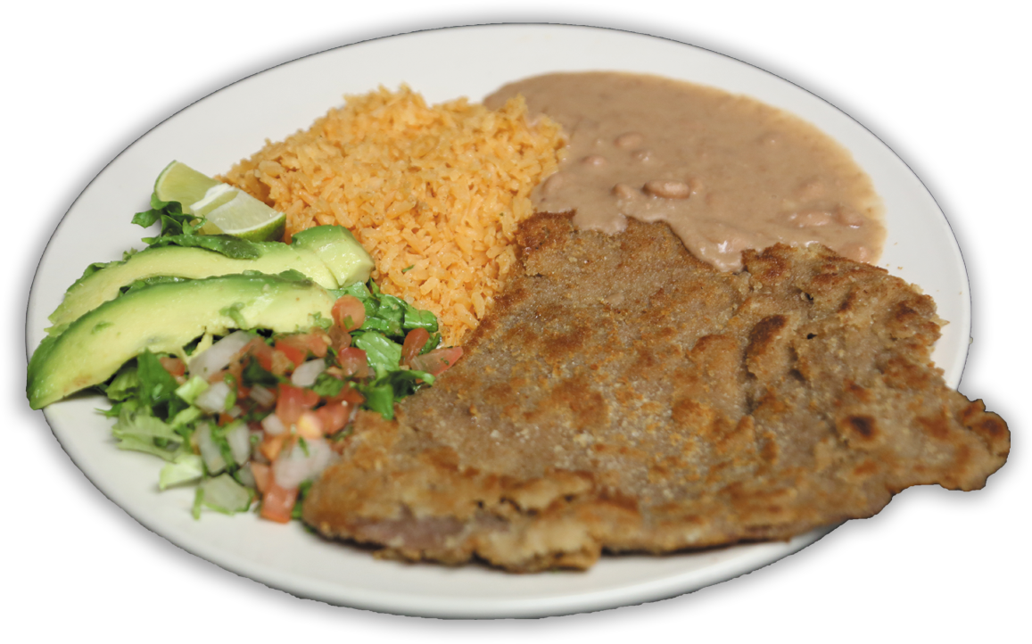 Deep fried tilapia fish served with rice and side of salad, pico, avocado, tomatoes and lime.